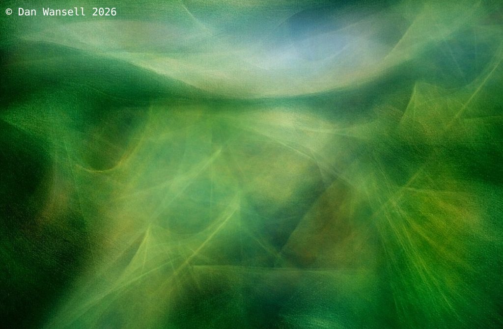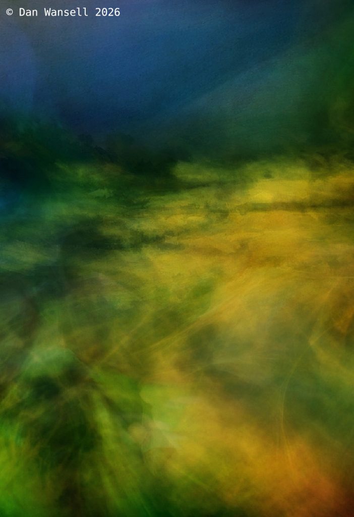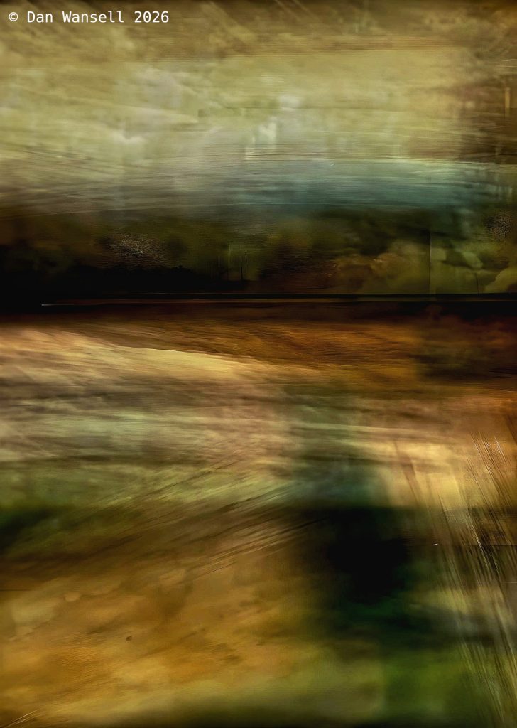 This work began as a loose, instinctive exploration of colour and movement rather than a fixed landscape. I built this digital image through soft, translucent photographic layers, allowing blues, greens and ochres to drift into one another, much like light moving across fields under a changing sky. Gentle blurring and sweeping gestures were used to remove detail and encourage the viewer to slow down, read the space emotionally, and find their own horizon within it. The process was deliberately unhurried, valuing intuition, balance and atmosphere over precision.